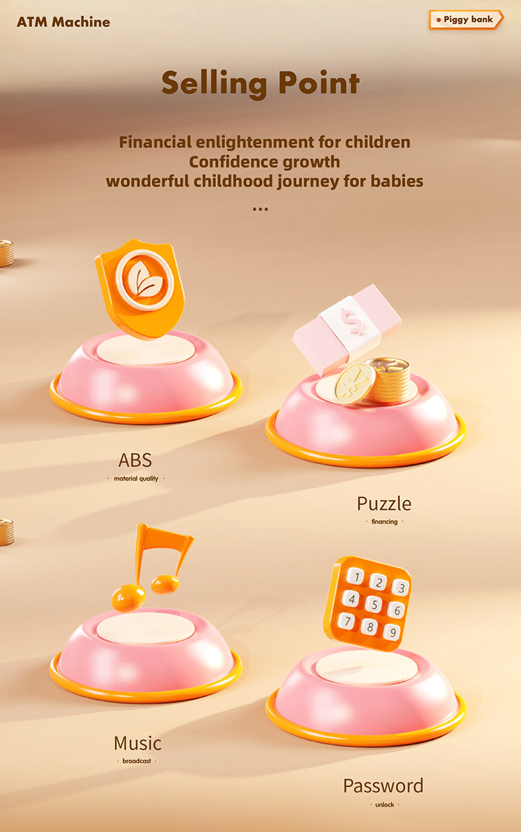 Introduce your children to the world of financial management with this cute and fun ATM Machine Piggy Bank. This thoughtful toy is designed as a "child financial manager" to help kids learn about saving money from an early age. It simulates real ATM operations, including card insertion, password entry, and even simulated facial recognition for a high-tech feel. With an automatic slot for paper money and a separate one for coins, saving becomes an exciting activity. The machine also features accompanying music and sound effects, making children fall in love with saving their money.