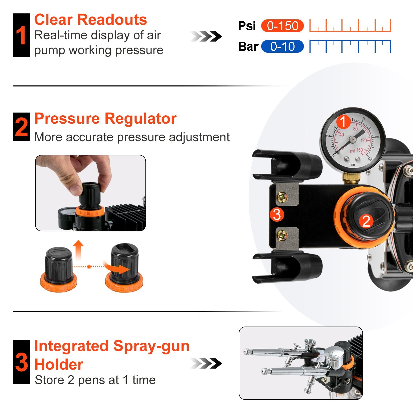 Get ready to create a new path of creativity. The high-efficiency air compressor can be inflated quickly and operate for long periods stably. Equipped with an adjustable pressure valve, you can conveniently check the real-time pressure. We also designed a convenient handle on the machine top for you to carry and move.